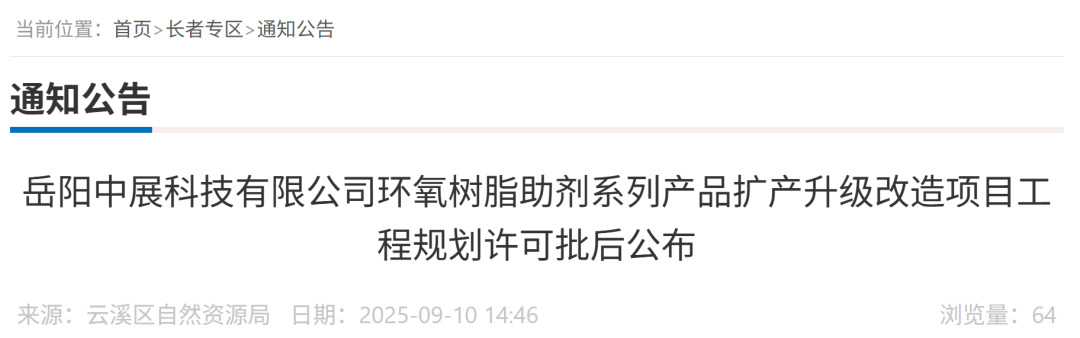 近日,云溪區(qū)自然資源局對(duì)岳陽(yáng)中展科技有限公司"環(huán)氧樹(shù)脂助劑系列產(chǎn)品擴(kuò)產(chǎn)升級(jí)改造項(xiàng)目"工程規(guī)劃許可進(jìn)行公布。